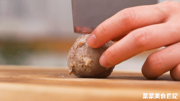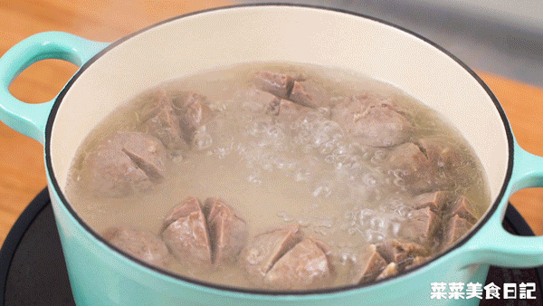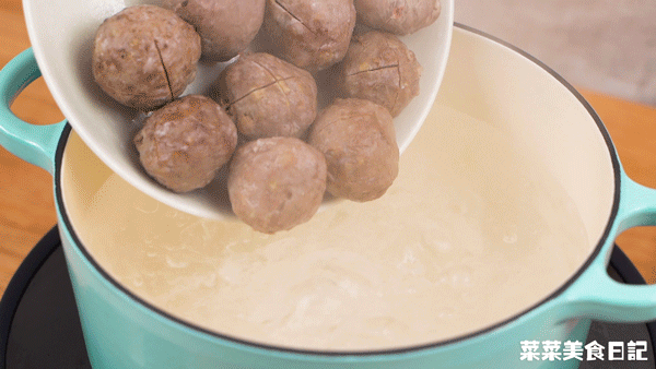 牛肉丸對半改花刀,加入沸水中煮5分鍾,期間加點食用油。
