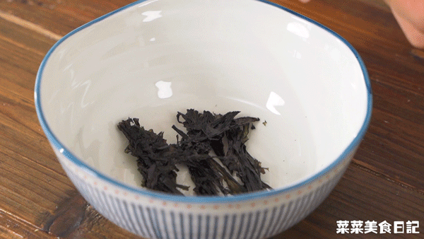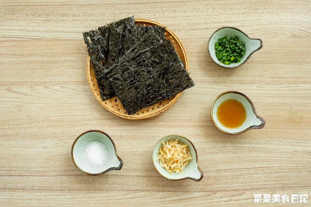 火都不用開,碗中放入撕碎的頭水紫菜、洗淨的蝦皮、鹽、蔥花,倒入開水,最後滴入適量香油。