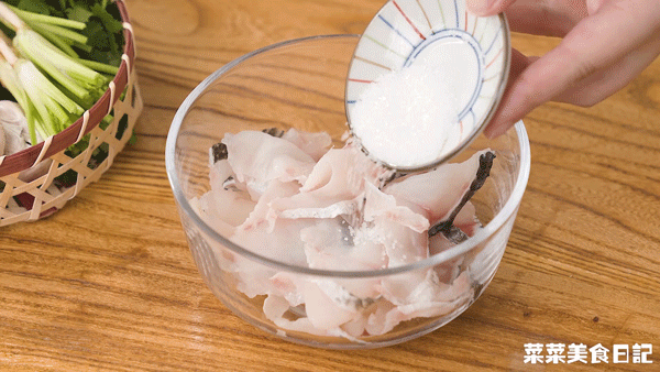 魚片用鹽、食用油、料酒、澱粉提前醃制20分鍾。