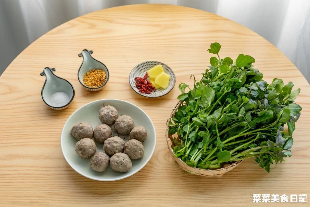 西洋菜牛肉丸湯西洋菜500g 牛肉丸200g 枸杞15顆 姜片5片 鹽1小勺 炸蒜(可選)