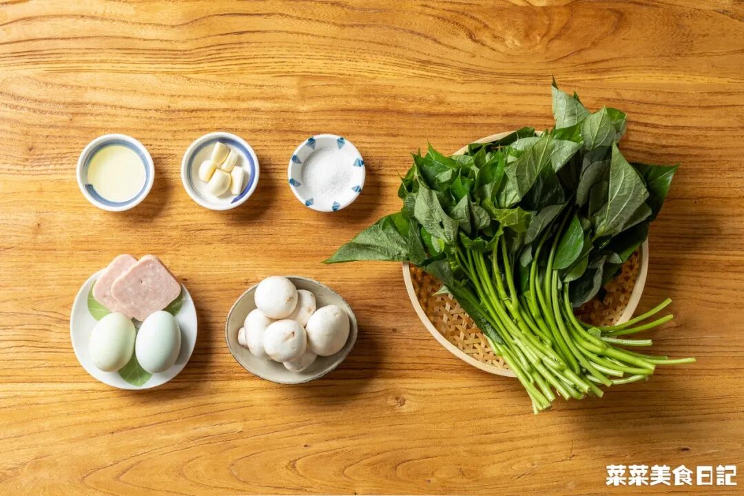 上湯紅薯葉紅薯葉150g 口蘑4個 火腿30g 皮蛋1個 鹹蛋1個 蒜3瓣 鹽1/2小勺(可選)食用油1大勺