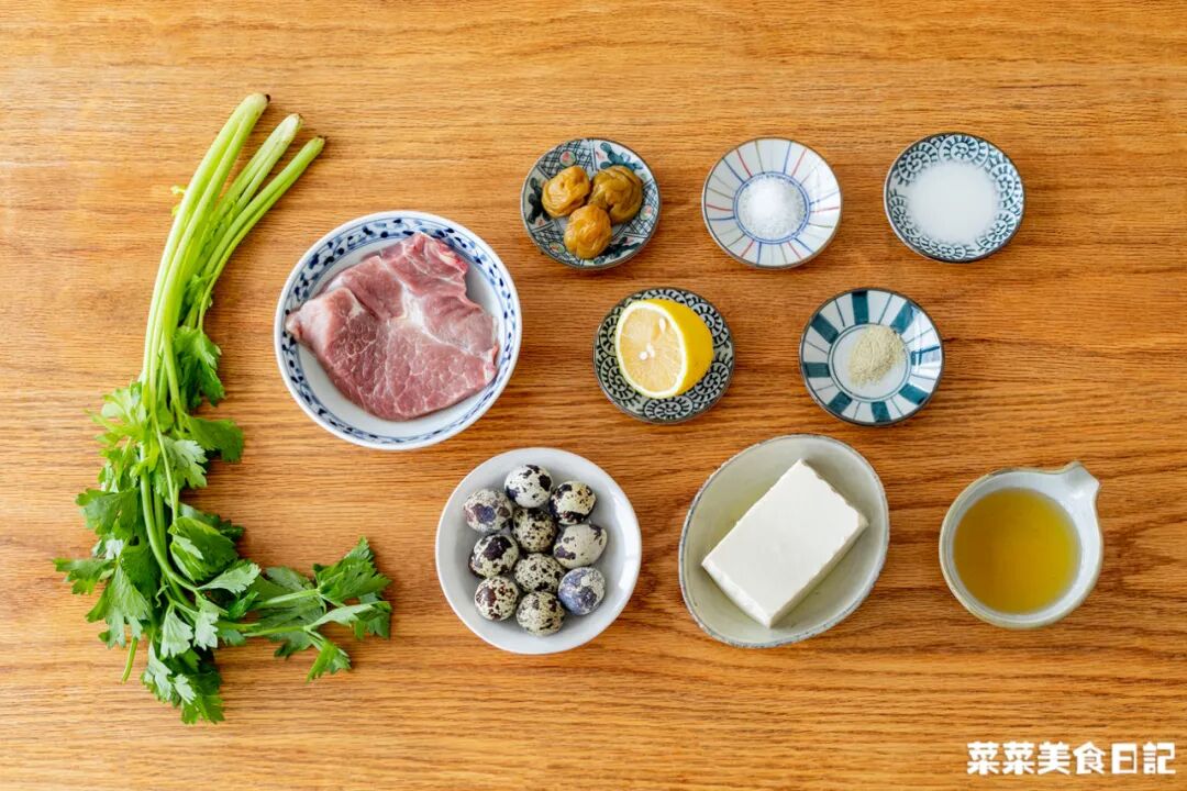 鹹梅促肉梅花肉/豬展肉/豬伍花150g 鹹梅3顆 鵪鶉蛋8個 豆腐半塊 芹菜1根 檸檬1/4個 鹽1小勺 胡椒粉1/2小勺 澱粉水1大勺 食用油適量