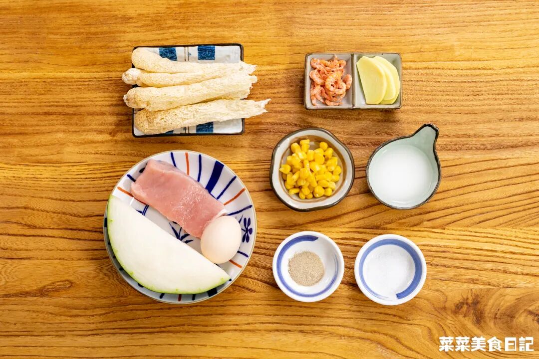 冬瓜竹蓀滾湯冬瓜300g 竹蓀50g 玉米粒100g 豬肉100g 磷蝦5g 姜3片?鹽、胡椒粉、水澱粉適量