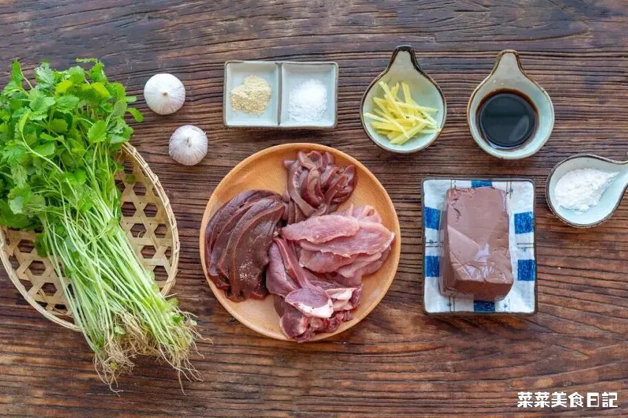 益母草豬雜湯新鮮益母草100g 裡脊50g 豬肝50g 豬心50g 豬腰50g 豬紅30g 生姜10g 獨蒜2顆?生抽1小勺 鹽、胡椒粉、澱粉適量