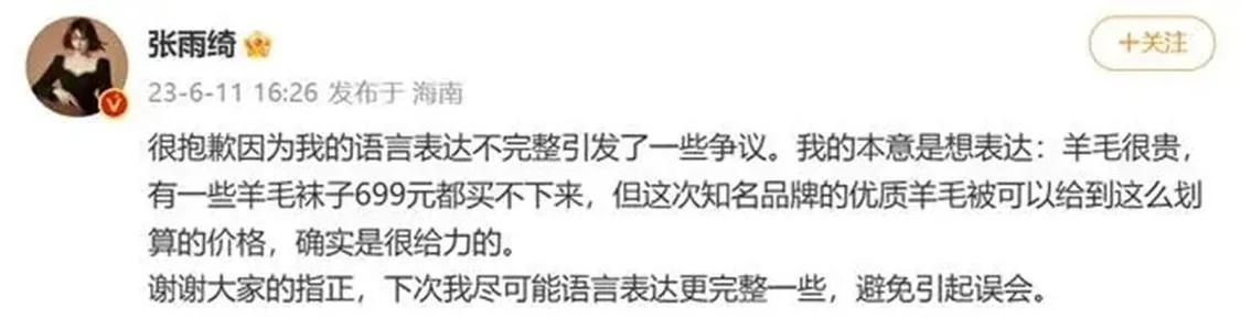 雖然張雨綺很快發文解釋了,但是這個解釋跟沒有解釋也沒啥區別。她所表達的意思依然是,有壹些羊毛襪子699元都買不下來,而她參與帶貨的優質羊毛被價格卻很劃算。但問題的症結在於,699壹雙的襪子,普通人不要說穿了,可能連見都沒見過,人無法對自己認知以外的東西產生清晰的印象,自然也感受不到她所表達的“優惠”,反而會更多地感受到高收入的明星的“傲慢”。