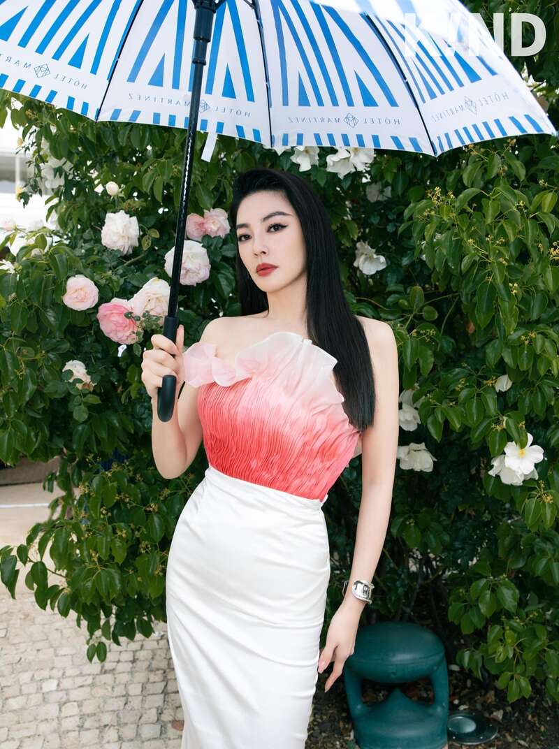 粉色荷葉上衣,搭配包臀半裙,撐著陽傘,袒露香肩,散發迷人氣息。