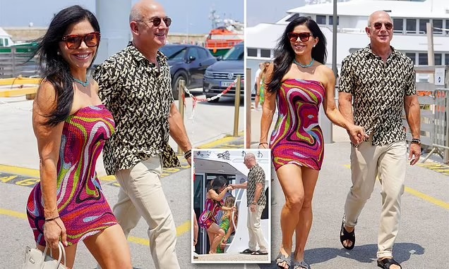 今天周六,這對新訂婚的情侶在聖特羅佩微笑牽手漫步。53歲的桑切斯換上壹件顏色鮮艷的無肩帶迷你裙作為今天的行頭,戴著亮瞎眼的訂婚鑽戒,59歲亞馬遜億萬富翁壹路牽手護送她上下船。