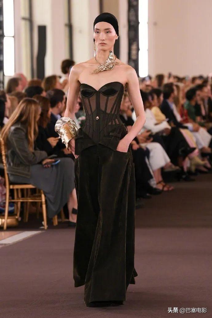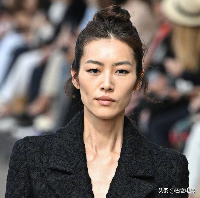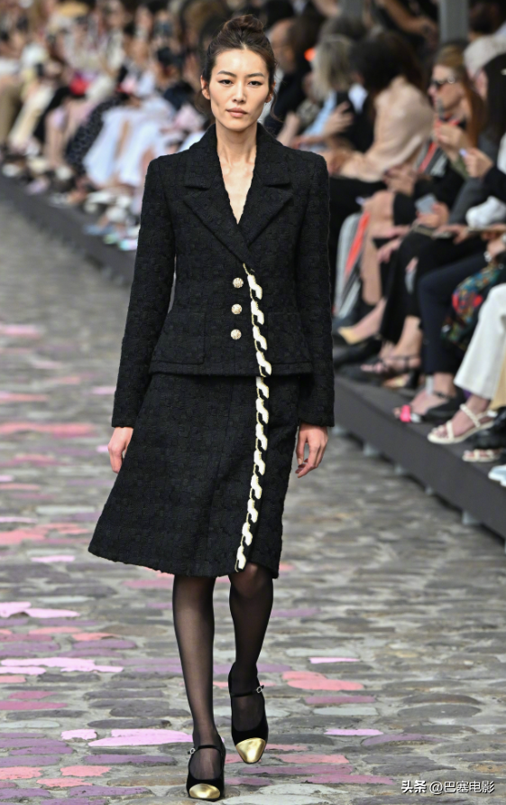 另壹場秀上劉雯穿的是小香風的黑色套裝,她的身材配上這樣的服裝,顯得人更修長了。服裝沒什麼大問題,但她這臉是真的怪,歪臉拾分明顯,左右臉還極其不對稱,大小眼也是顯而易見,怎麼到了國外秀場劉雯還變樣了?