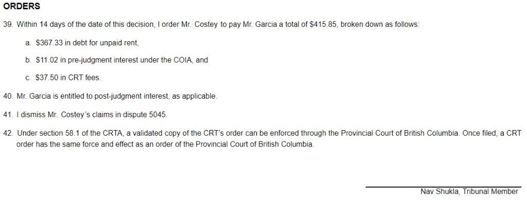 根據雙方的郵件證據,法官認為 C 應當向 G 支付所拖欠的房租以及互聯網費用,除去 G 已經扣留的押金 367 元之外,法庭裁決最終 C 還需向 G 支付剩余的 367 元、以及判決前產生的利息 11 元,外加 CRT 民事法庭的調解費用 37.5 元。