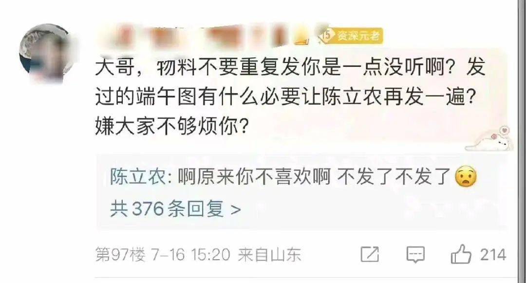 陳立農工作室重復發相同的物料被粉絲吐槽,陳立農親自下場在評論區維護:啊原來你不喜歡啊,不發不發了!早都說了,粉絲永遠是外人,藝人跟團隊才是壹條心,可能有些大事還不好做主,但是像發物料這種事情,陳立農完全是有話語權的,人自己都不想管由著工作人員去了,粉絲壹直維權也沒什麼意思。