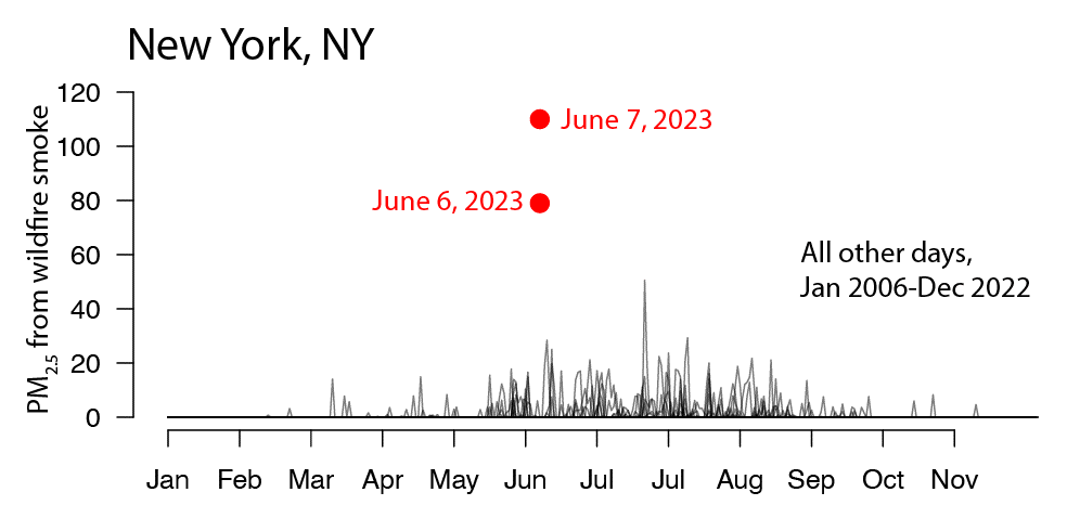 圖4 紐約山火PM2.5在2023年6月來到新高。數據來源:美國環境保護署、斯坦福大學研究團隊。