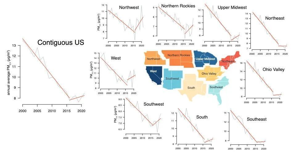圖5 美國各個地區2000-2023年間PM2.5濃度,多數地區PM2.5下降的趨勢在2015年前後開始放緩,山火產生的PM2.5在很大程度上逆轉了過去20年美國空氣質量改善的趨勢。圖源[3]