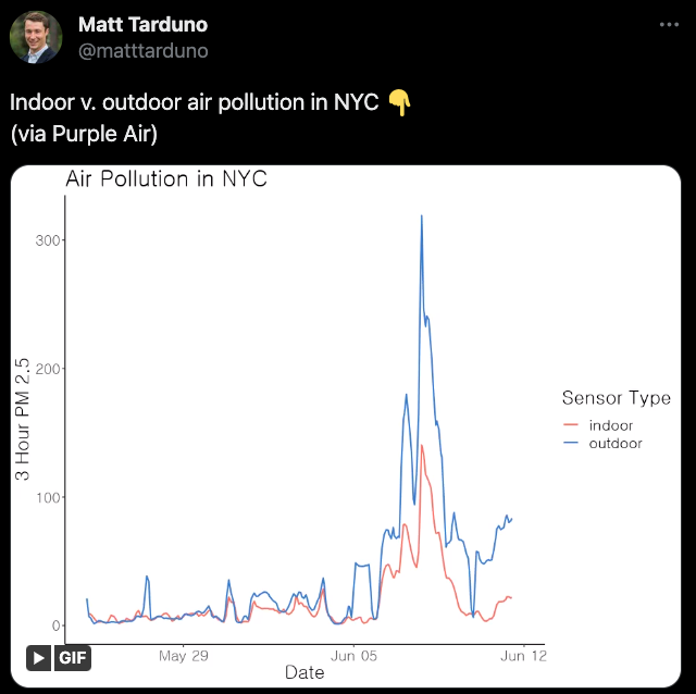 圖6 紐約山火期間室內與室外PM2.5濃度的對比。