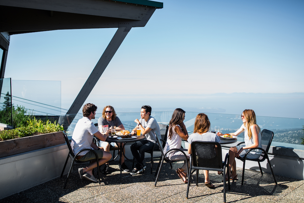 别忘了在松鸡山山顶享受一顿完美的晚餐—在Altitudes Bistro(高出低陆平原约 3,700 英尺)的露台上有许多美味的食物和饮料,包括著名的松鸡山玉米片(Grouse Mountain nachos)。