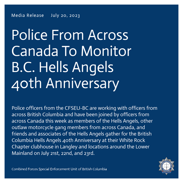 B.C. 聯合部隊特別執法隊(Combined Forces Special Enforcement Unit,CFSEU)周伍發表聲明稱,預計幫派成員、他們的家人和朋友將於周伍、周六和周日來到位於蘭裡(Langley)的白石分會會所,以及大溫和菲沙河谷的其他社區。