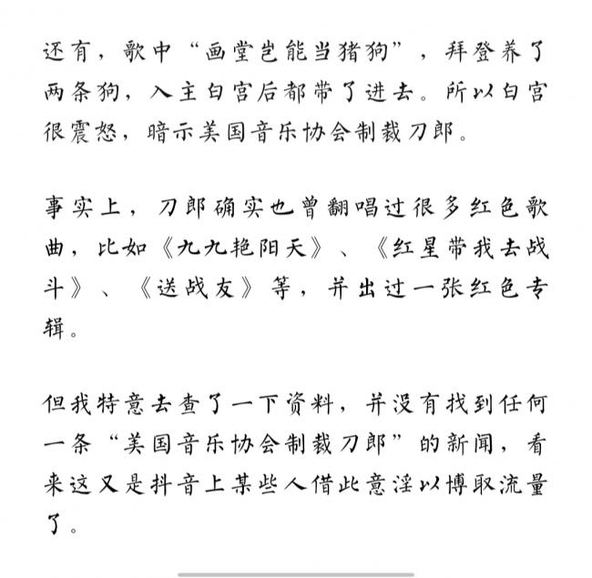 這篇文章其實就是拼貼了壹下刀郎的生平經歷,再加上別人對刀郎歌曲的解讀,湊了本文的主體,然後文尾復述了壹下網上的謠言,並進壹步確切說“白宮很憤怒”,但最後來個急轉彎,端正態度,說“看來這又是抖音上某些人借此意淫以博取流量了。”