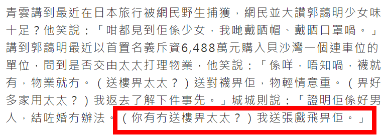 記者馬上訪問城城,“你有沒有送樓給太太?”