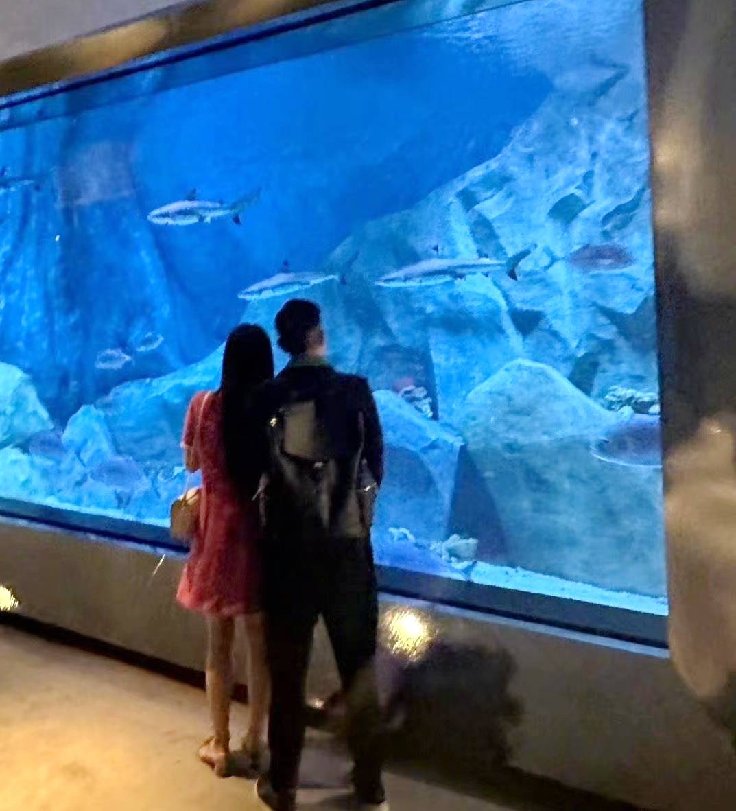 圖片中,郭富城夫婦表現恩愛,兩人在水族館前合影,從拍攝角度判斷,大概是兩人女兒。