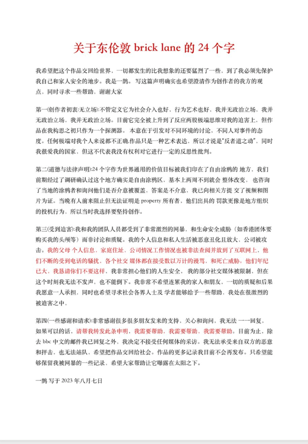 目前,引起轟動的倫敦塗鴉牆策劃者壹鵲發布最新聲明解釋自己“沒有政治立場”,還聲稱自己遭受了網絡暴力。