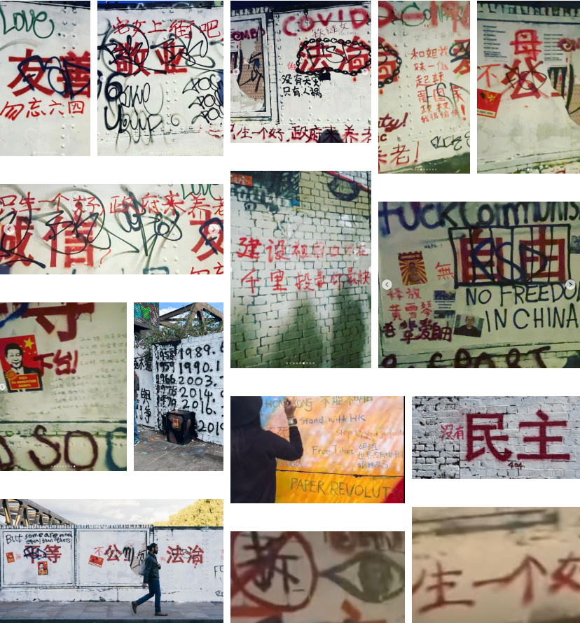 有不少倫敦網友前往現場在塗鴉牆上進行了贰次創作,留下了大量反擊中共宣傳的圖案/文字,令“愛國牆變成了辱華牆”。從網友現場拍攝的照片來看,塗鴉牆上出現了涉及辱包、六肆、審查、女權、計生、防疫、李文亮、鐵鏈女、黃雪琴、反送中等話題的“敏感內容”,而這些後續創作也被網民稱為“真正的行為藝術”。