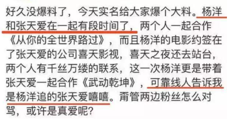 緊接著,楊洋和張天愛接連合作了《從你的全世界路過》和《武動乾坤》,兩人的緋聞也是逐步升級,拍攝期間就有現場兩人親密互動的路透,還曾被扒穿同壹件衣服,甚至還有爆料說是楊洋追的張天愛,可最終這段緋聞還是以楊洋采訪否認告終。