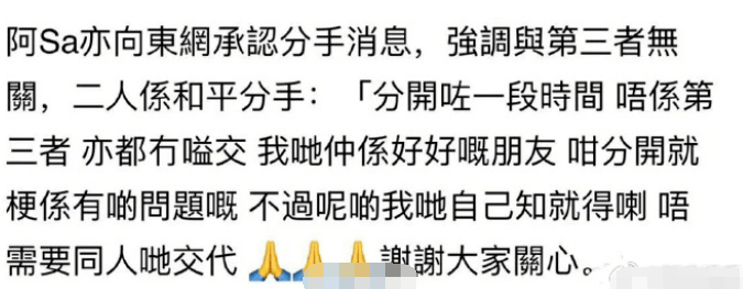 今天阿sa直接承認了分手的消息,但強調無關第叁者事,分開後大家還是好朋友,分手原因不會和人交代。