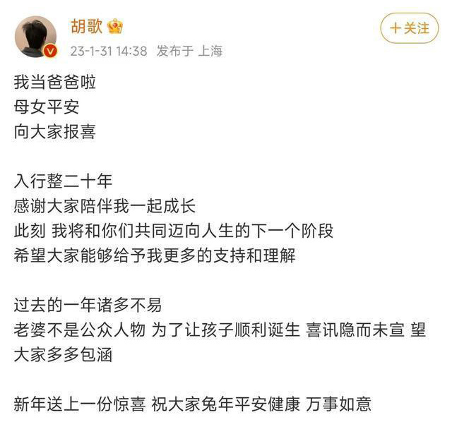 今年1月31日,胡歌發文宣布結婚生女喜訊:“我當爸爸啦,母女平安,向大家報喜”,他還透露,妻子不是公眾人物,為了讓孩子順利出生,因此喜訊隱而未宣,希望大家多多包涵。隨後,有網友扒出,胡歌的妻子正是已經在他身邊陪伴多年的貼身助理黃曦寧。