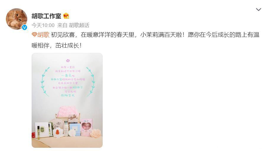今年5月5日,胡歌工作室發文慶祝胡歌女兒滿百天,透露女兒的小名是“小茉莉”。