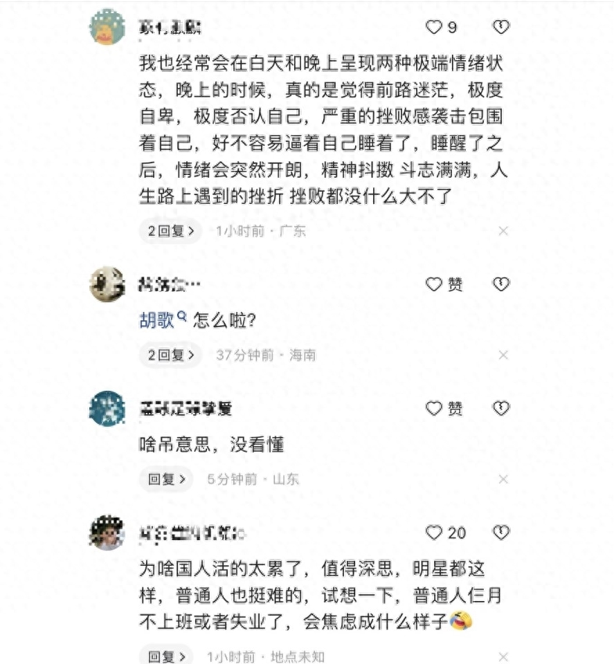 有些人認為,他們與胡歌在情感上存在共鳴,每天白天和晚上會經歷情感的兩極波動。晚上,消極情緒常常會籠罩心頭,伴隨著自卑感和困惑感。然而,第贰天早上醒來,積極的情緒又會回來,信心滿滿。這種情感的起伏變化,似乎是每個人生活中的壹部分。