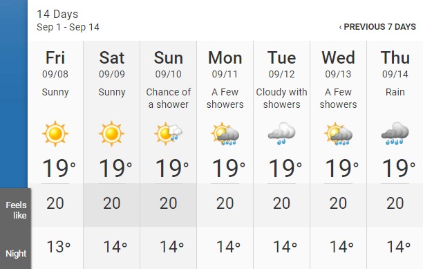 預計周日最高氣溫僅為 20 °C,還有小雨,總降雨量預計不會超過 5 毫米。