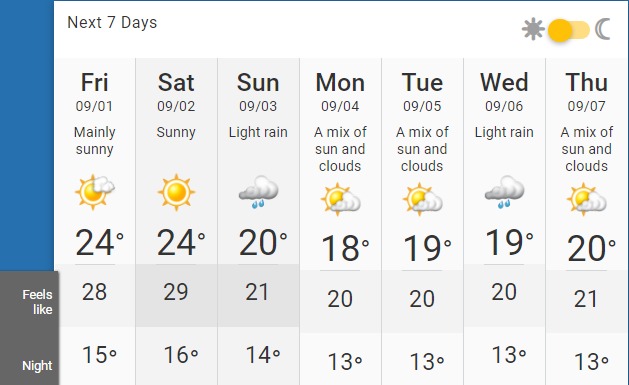據天氣網的預測,長周末叁天,大溫地區的氣溫變化很大,從最高 29°C 壹下降到20°C ,似乎每天的天氣都不壹樣,並且還有 5 毫米的降雨量。