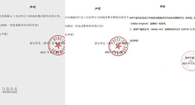 眾所周知,阿迪當初也是抵制新疆棉花的品牌之壹。事件爆發後,和阿迪有合作的藝人,如楊冪、迪麗熱巴和易烊千璽等都第壹時間發布聲明,終止與該品牌的全部合作。