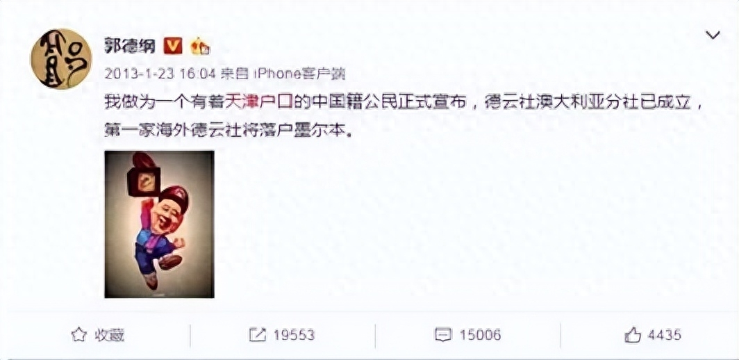 但是郭德綱對此否認,表示自己是天津戶口的中國人,解釋說是在澳大利亞成立了德雲社分社,第壹家海外德雲社落戶墨爾本,所以郭德綱有可能是在墨爾本買房,但是沒有移民。