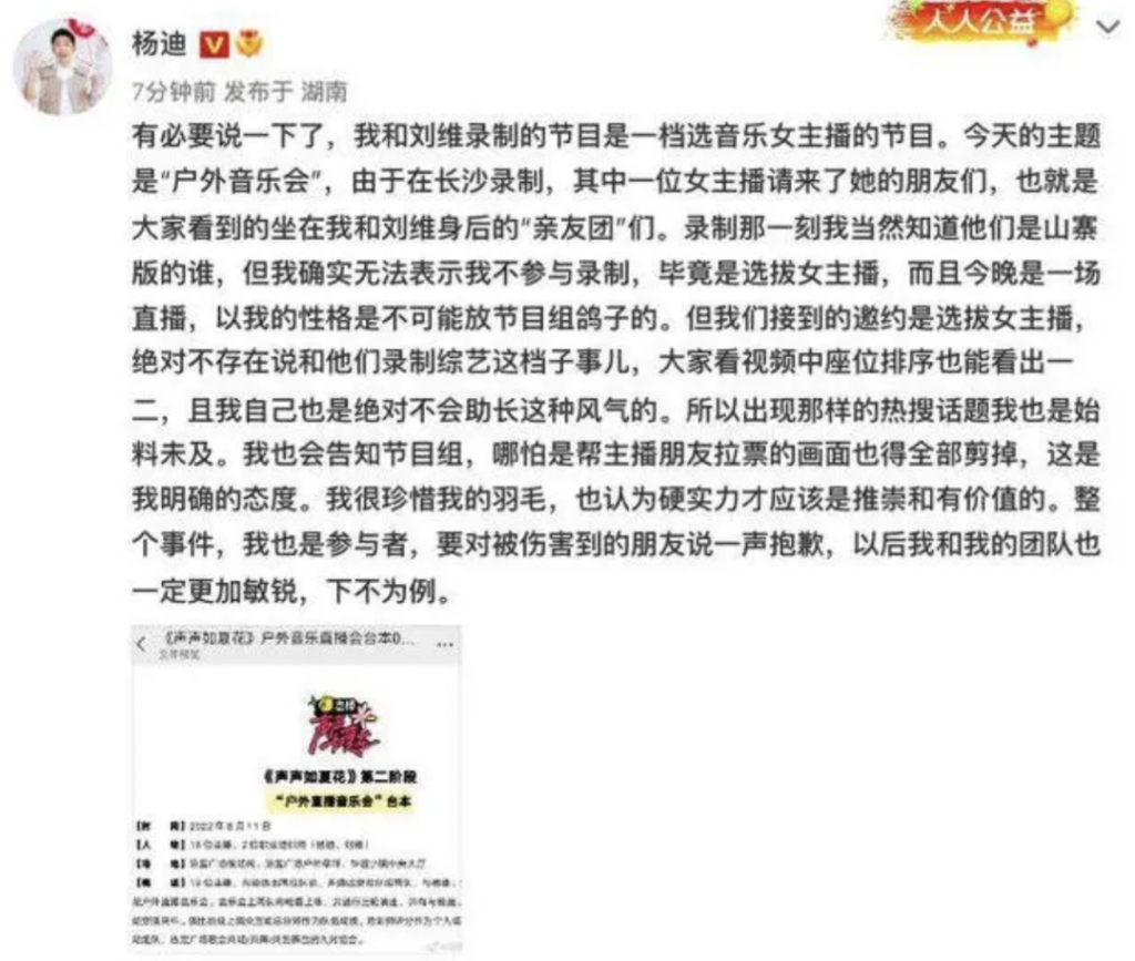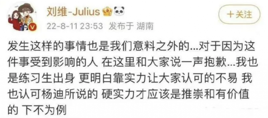 劉維隨後也發聲表示自己支持楊迪??
