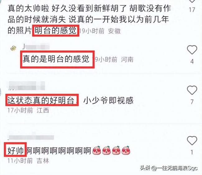 胡歌從不懼在人前袒露傷痕,真正高顏值的人也不怕展現自己頹廢的壹面。此前胡歌頻頻曬出頹廢自拍令人擔憂,看到如今的他狀態回春粉絲也是欣慰又欣喜。願胡歌找到自我,壹生向陽。