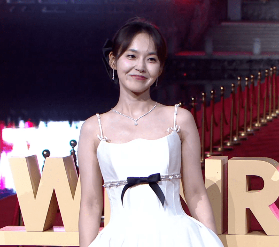 張佳寧的造型比較公主風,簡約的吊帶白裙和雙低丸子頭搭配起來,遠遠看著挺減齡的。