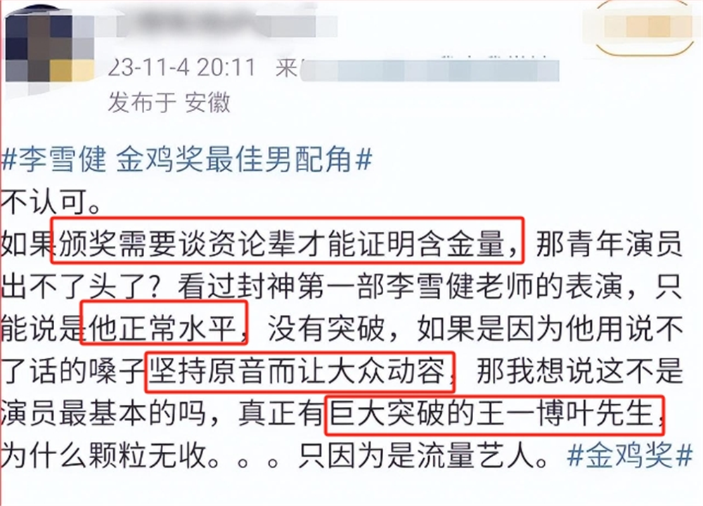王壹博粉絲們的所作所為及破防言論更讓旁人覺得金雞獎儼然成為了“照妖鏡”。