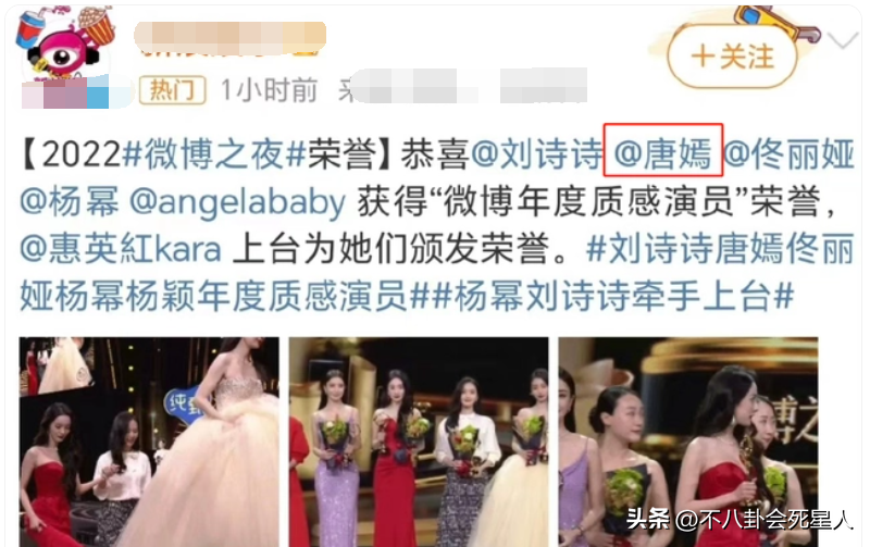 據悉,她當天被安排了某直播活動,時間與微博之夜有沖突,唐嫣趕到晚會現場時已經遲到了,會場直接就沒人她進去。