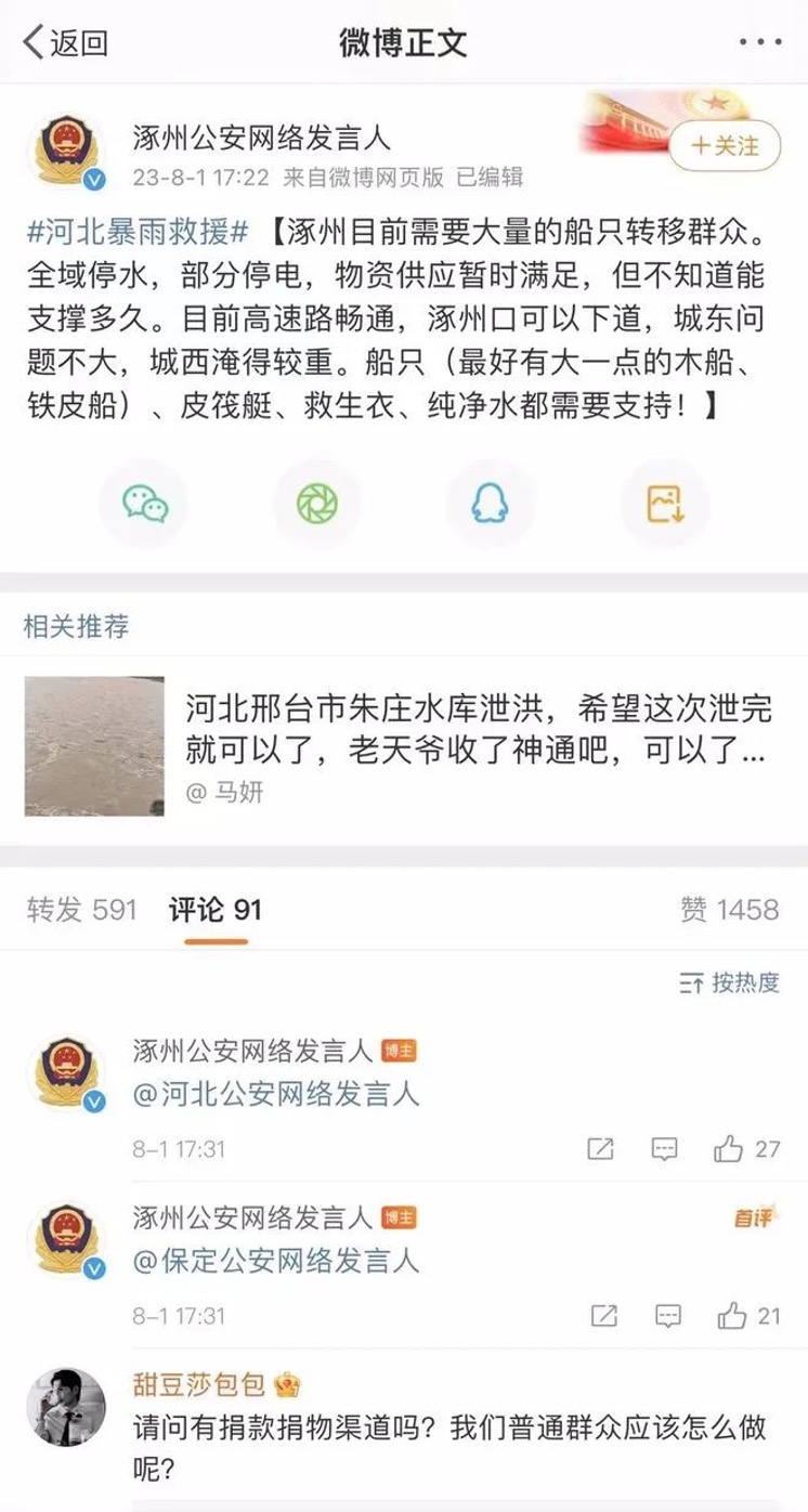 8月1日下午17時22分,涿州市公安局官方微博賬號“@涿州公安網絡發言人”發布求援消息稱: