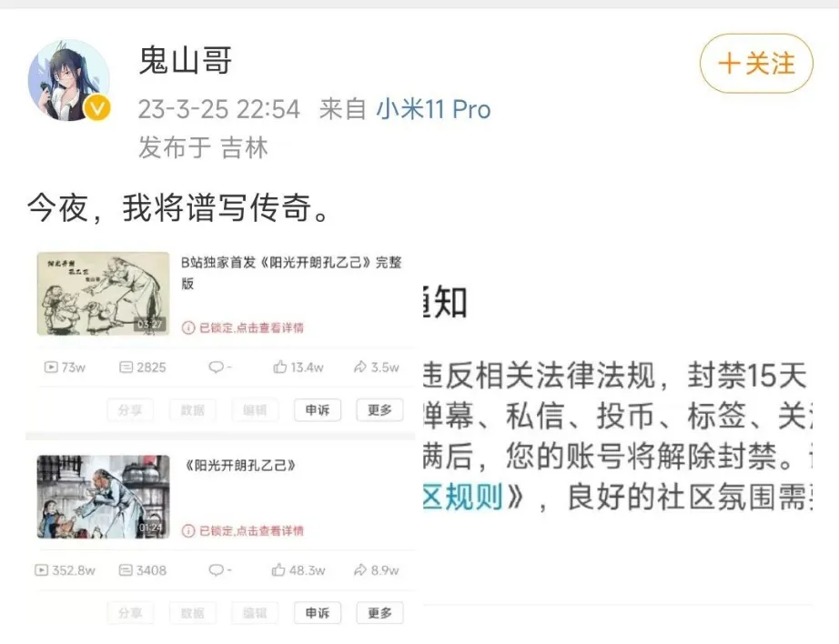 這首歌壹經發布,引起B站網友關注和熱議。視頻播放量達到了300萬+,很多網友通過評論區留言及發送彈幕的方式表達對創作者的敬佩,並諷刺官媒的宣傳。然而,B站很快刪除了《陽光開朗孔乙己》視頻,並對作者@鬼山哥 的賬號做出封禁15天處理。