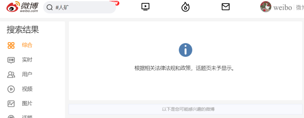 新浪微博將“人礦”壹詞完全禁搜並清理,僅可檢索到壹條相關微博。之前登上熱搜第11位的#人礦 話題被下線,文案顯示為:“根據相關法律法規和政策,話題頁未予顯示。”但同時微博禁搜規則較簡單,“人 礦”、“Humineral”、“Renmine”等寫法未被禁搜。