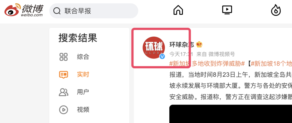 盡管微博平台未將“劉夢熊”的搜索結果屏蔽,僅針對個別信息實施了“定點清除”。但對“聯合早報”的搜索結果疑似做出了限制,用戶僅能看到“加V”(認證)賬戶所發的內容。
