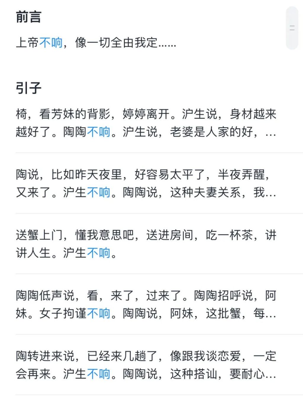 全書中總共出現了壹千多處“不響”,留下無數曖昧不明、無法言說的空白。