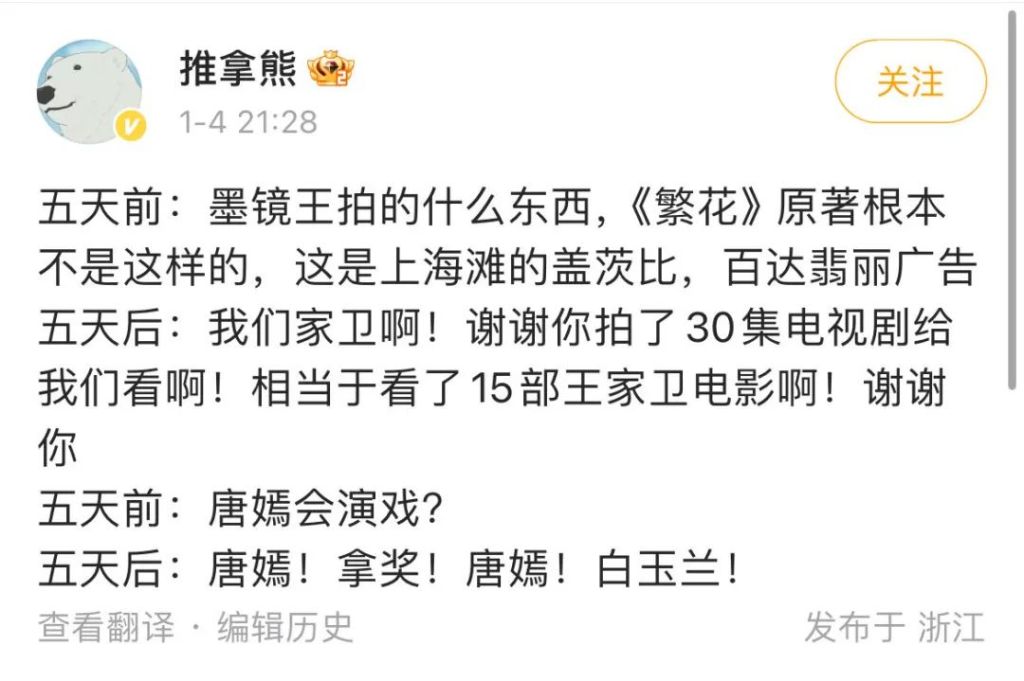 在前陣子網絡壹片罵聲“王家衛拍《繁花》是郭敬明《小時代》翻版”之後,很多撐完滬語版前5集的觀眾卻表示:罵早了,我真香了。
