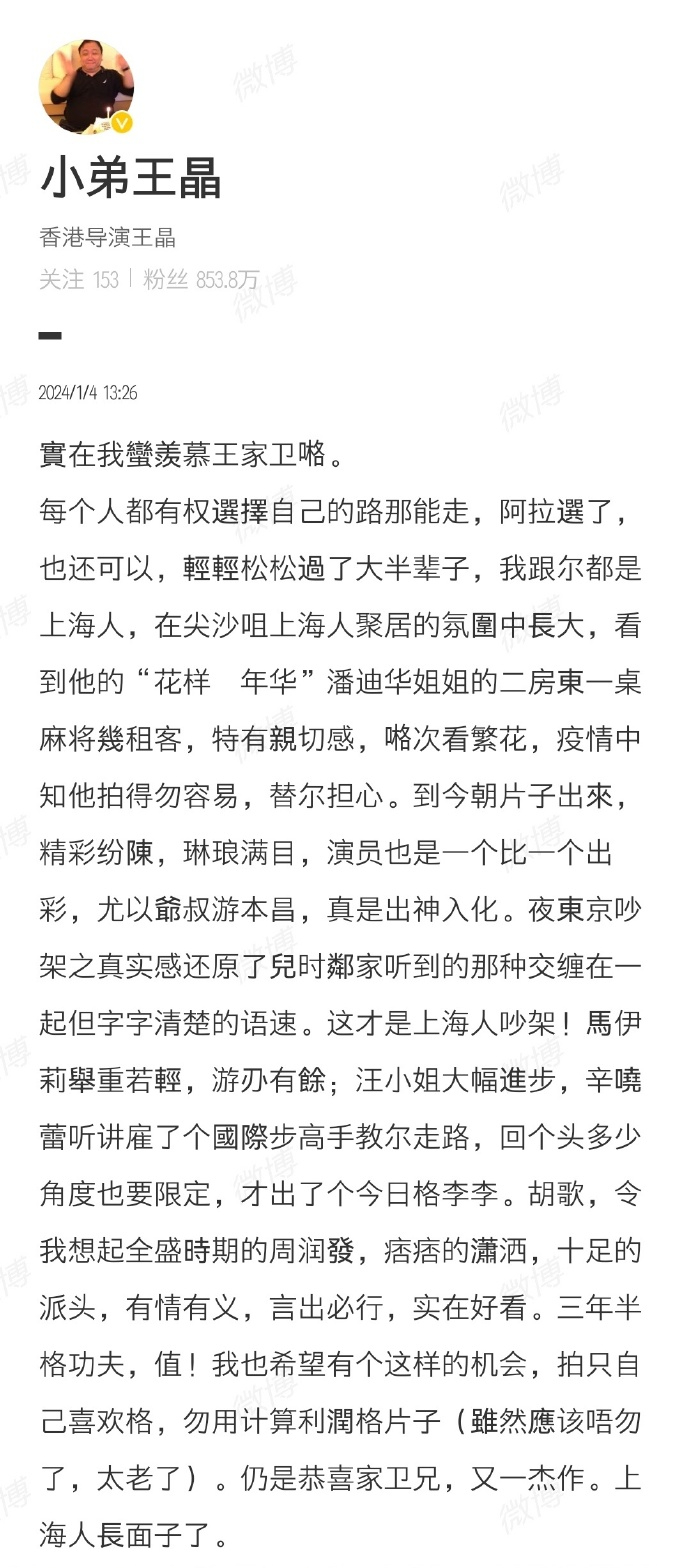 要給王家衛道歉的人,從黃河路排到了乍浦路,王家衛微笑地看著評論區,不響。