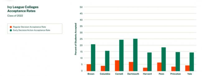 下图是2022届八大常春藤盟校录取统计数据,黄色部分为RD录取比例,绿色部分为早申录取比例。