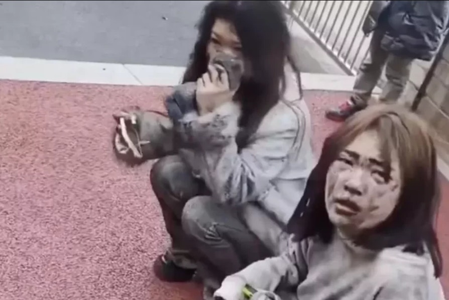 年轻受困者爬梯逃生,有人拉着路边的电缆线摔下楼(点图放大):