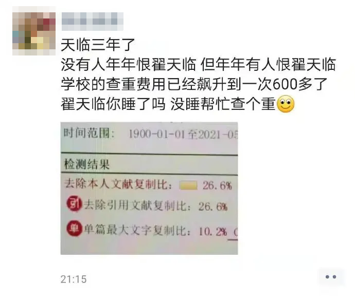 此外,畢業生在論文查重上要額外花費數百乃至數千元:這筆錢他們特別希望翟天臨能給報銷壹下。