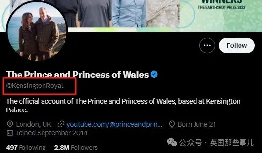 類似的,威廉夫婦現在的推特賬號是@KensingtonRoyal,直譯就是“肯辛頓王室”,不能直接就叫“肯辛頓”。