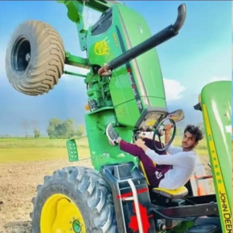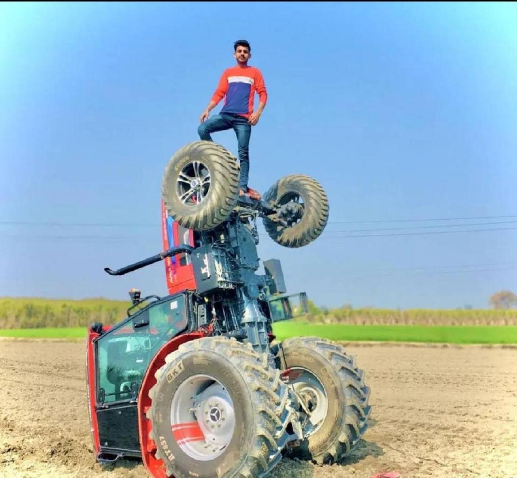 而网红Nishu Deshwal眼疾手快,三步并作二步,直接上了拖拉机的驾驶位置,然后利用自己的“高超”的驾驶技巧,控制着拖拉机把两个前轮抬起来。